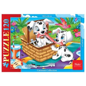 Для более опытных поклонников игры в пазлы создана линейка в 120 элементов. Задача усложняется, процесс становится интереснее. Дизайны специально разработаны по сложности для дошкольников и младших школьников. Размер пазла «Щенки далматинцы» в собранном виде (ДхШ) составляет 23х16,5 см. Изготовлено из картона и бумаги. Рекомендованный возраст: 3 года +
