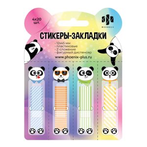 Закладки самоклеящиеся " Феникс " Панды 12*45мм, 4цв*20л пластик, диспенсер, мелованная подложка, европодвес, пакет