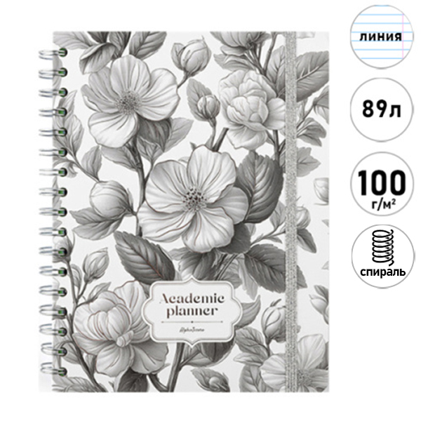 Планинг спираль на резинке " Альфа-Тренд " 175*230мм 89л Серебро, линия, обложка- матовый ламинированный картон, белый офсет 100г/м2, тиснение фольгой, печать в 2 краски, 3 цветных разделителя, скругленные углы, индивидуальная упаковка