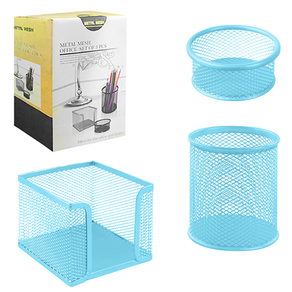 Набор аксессуаров настольных " KWELT " 3шт, металлических, сетчатых, голубых, в наборе: стакан 8*9,5см, бокс для бумаг 9,5*9,5*8см, подставка для мелочей 8*3,5см, картонная упаковка