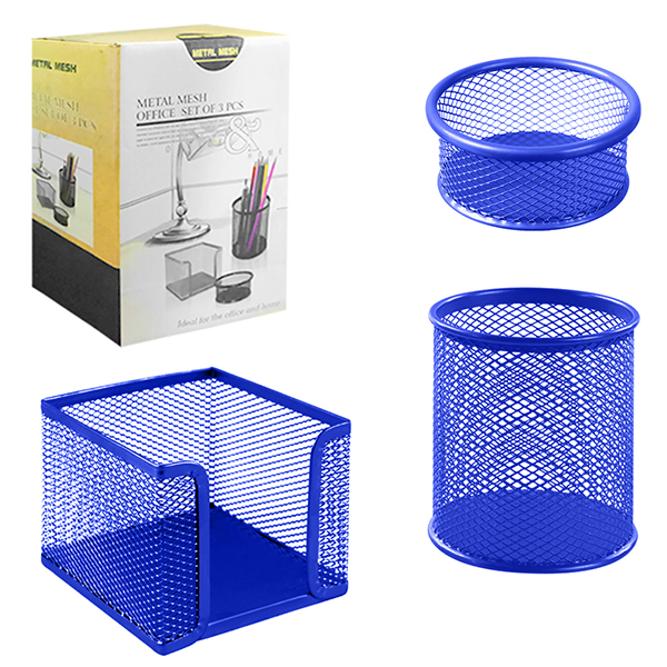 Набор аксессуаров настольных " KWELT " 3шт, металлических, сетчатых, синих, в наборе: стакан 8*9,5см, бокс для бумаг 9,5*9,5*8см, подставка для мелочей 8*3,5см, картонная упаковка