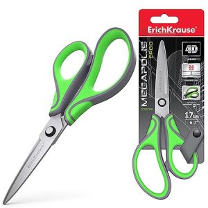 Ножницы " Erich Krause " Megapolis Ergo 17см металлические, эргономичные ручки, с резиновыми вставками, серо-зеленые, картонная упаковка, европодвес