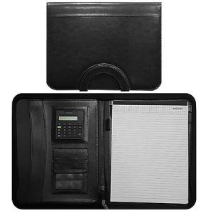 Папка кожзам " KWELT " 25*34*2см черная, с бумажным блоком, калькулятор, отделение для карточек, с ручкой на магните, на молнии, держатель для ручки, прошивка по периметру