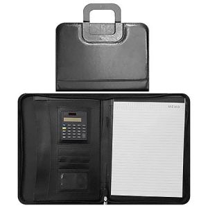 Папка кожзам " KWELT " 25*34*2см черная, с бумажным блоком, калькулятор, отделение для карточек, с ручкой на магните, на молнии, держатель для ручки, прошивка по периметру