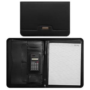 Папка кожзам " KWELT " 33*25*2см черная, с бумажным блоком, калькулятор, отделение для карточек, на молнии, держатель для ручки, прошивка по периметру