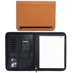 Папка кожзам " KWELT " 33*25*2см коричневая, с бумажным блоком, калькулятор, отделение для карточек, на молнии, держатель для ручки, внешний карман, прошивка по периметру