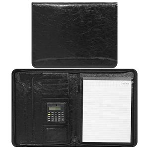 Папка кожзам " KWELT " 35*26*3см черная, с бумажным блоком, калькулятор, отделение для карточек, с выдвижной ручкой, на молнии, держатель для ручки, прошивка по периметру