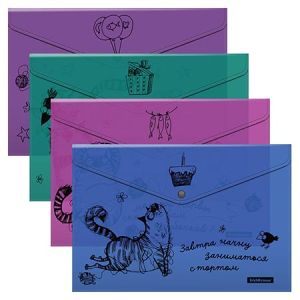 Набор из 4 папок-конвертов на кнопке формата А4 из высококачественного пластика с текстурой поверхности "зеркало". Предназначена для хранения и транспортировки небольшого количества документов. Надежная застежка-кнопка обеспечивает быстрый доступ к документам. В наборе представлены 4 дизайна коллекции. Папка вмещает до 120 бумажных листов.Размер - 232х333мм, толщина - 0.16мм Код и баркод на каждой единице товара.