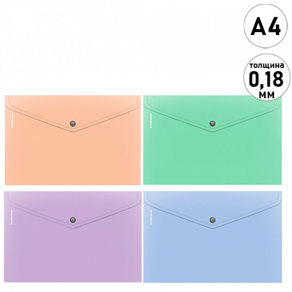 Папка-конверт на кнопке формата А4 из высококачественного непрозрачного пластика с текстурой поверхности "песок", на которой не видно отпечатков пальцев и мелких царапин. Предназначена для хранения и транспортировки небольшого количества документов. Цвет папки - ассорти: голубой, зеленый, персиковый, фиолетовый. Надежная застежка-кнопка обеспечивает быстрый доступ к документам. Папка вмещает до 120 бумажных листов. Размер - 232х333мм, толщина - 0.18мм. Код и баркод на каждой единице товара.