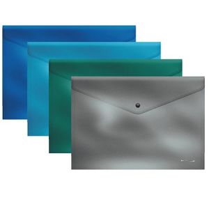 Папка-конверт на кнопке формата B5 из высококачественного непрозрачного пластика с текстурой поверхности "зеркало", на которой не видно отпечатков пальцев и мелких царапин. Предназначена для хранения и транспортировки небольшого количества документов. Цвет папки - ассорти: голубой, серебристый, бирюзовый, синий. Надежная застежка-кнопка обеспечивает быстрый доступ к документам. Размер - 285х210х9мм, толщина - 0.18мм.