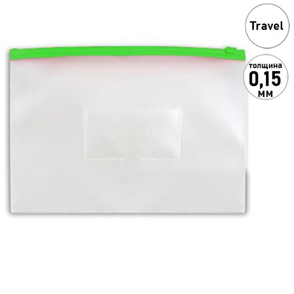 Папка на молнии " Бюрократ " МАЛЫЙ ФОРМАТ Travel (265*148мм) ZIP зеленая молния, пластик 0,15мм, прозрачная, карман под визитку