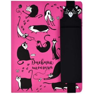 Дневник школьный арт. 54203 / 15 КОТЫ (7БЦ: А5+; твёрдый переплёт, материал обложки: мелованная бумага 250 г/м2; декор: полноцветная печать; способ крепления блока: ниткошвейный, вн. блок: 48 л., белый офсет 80 г/м2, печать в одну краску, справочный материал: универсальная шпаргалка; отделка среза: окрашивание пантоном; одно ляссе; форзац: печать пантоном; особенности: в комплекте с силиконовым пеналом на резинке (без наполнения); ПЭТ-пакет)