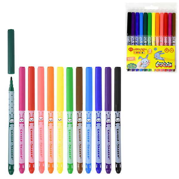 Фломастеры Каляка-Маляка® одни из самых ярких, долговечных и безопасных фломастеров на рынке. Разработаны для детей в возрасте от 3 лет. Богатая палитра ярких сочных цветов позволит детям воплотить любую фантазию в рисунок. Весёлые Зайчики на корпусе.Выпускаются в удобном пластиковом блистере с европодвесом. Толщина фломастера 8 мм. Диаметр пишущего наконечника 2 мм. В наборе 12 цветов.Фломастеры Каляка-Маляка® соответствуют самым высоким мировым стандартам качества и безопасности!•Обладают яркими, сочными цветами. •Полипропиленовый корпус обладает повышенной устойчивостью к излому, не образует острых краев при повреждении.