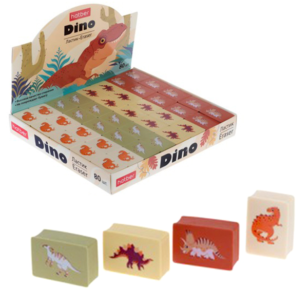 Ластик " Hatber " Dino 28*18*9мм, из термопластичной резины, ассорти, картонный дисплей