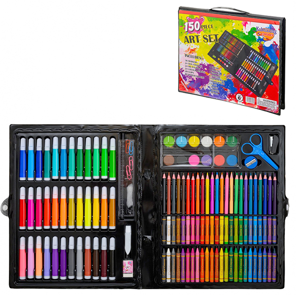 Набор для детского творчества: в виде папки-портфеля на кнопке; 150 предметов: цветные карандаши, восковые мелки, пастель, ч/г карандаш, фломастеры, краски, линейка, ластик, точилка, губка, скрепки, ножницы, мини степлер, кисть, клей, палитра.