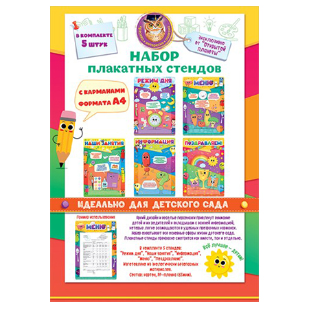 Набор плакатных стендов " Открытая планета " 893 для детского сада- 5шт- Информация, поздравляем, наши занятия, режим дня, меню- картон, карманы А4 из РР-пленки