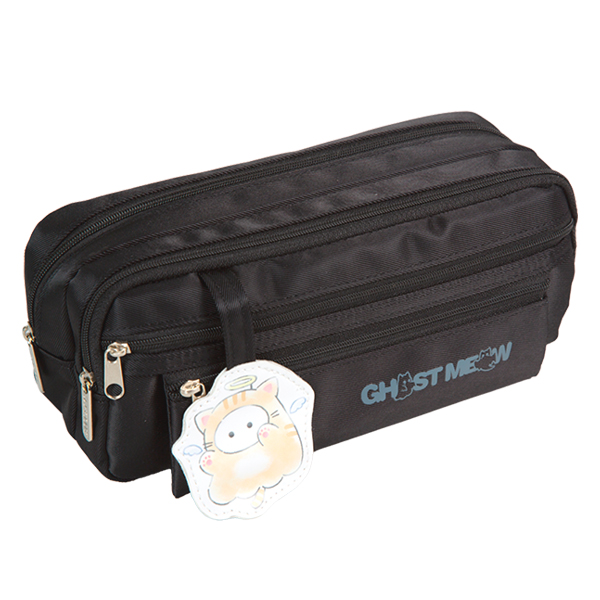 Пенал "deVENTE. Ghost Meow" 220x95x70 мм, плотный износостойкий полиэстер с водоотталкивающей пропиткой, 2 отделения на молнии, овальный для 60 предметов, 2 внешних кармана на молнии, декоративный элемент на липучке из искусственной кожи, черный
