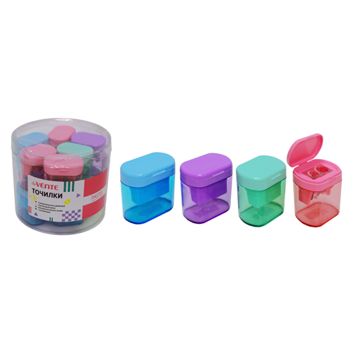 Точилка для карандашей "deVENTE. Pastel" 2 отверстия разных диаметров, с контейнером, пластмассовая, в пластиковой тубе, ассорти с индивидуальной маркировкой.