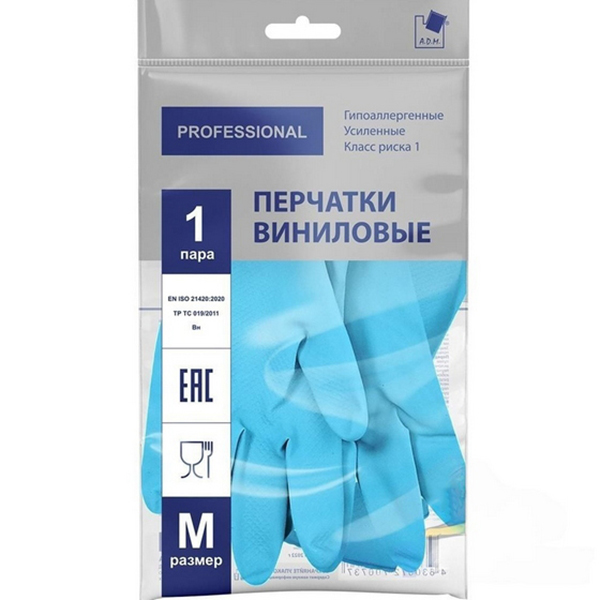 Перчатки виниловые, размер M, гипоаллергенные, усиленные, голубые, в упаковке " ADM Professional "