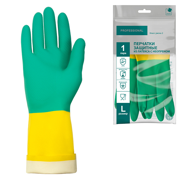 Перчатки зищитные КЩС, размер L, латекс и неопрен, зеленый+желтый, в упаковке " ADM Professional "