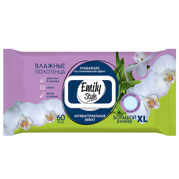 Полотенца влажные для всей семьи 60шт " Emily Style " Антибактериальные, клапан крышка