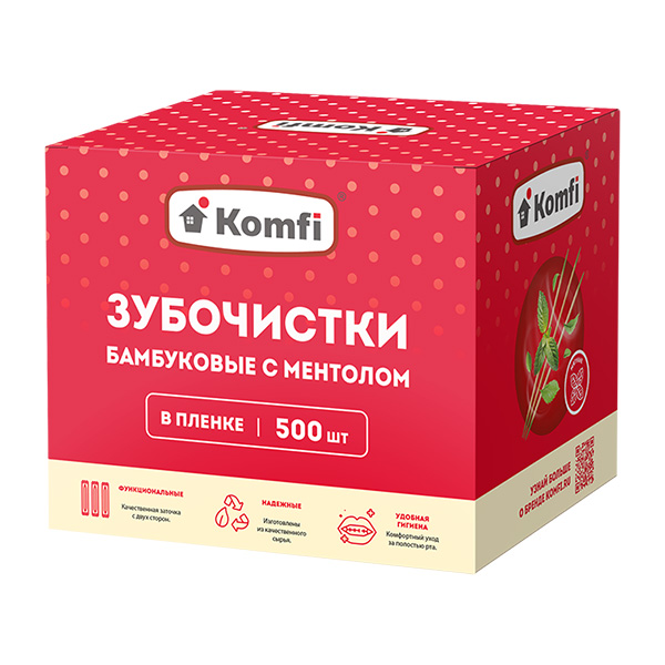 Зубочистки " Komfi " бамбуковые с ментолом 500шт в индивидуальной упаковке, картонная упаковка