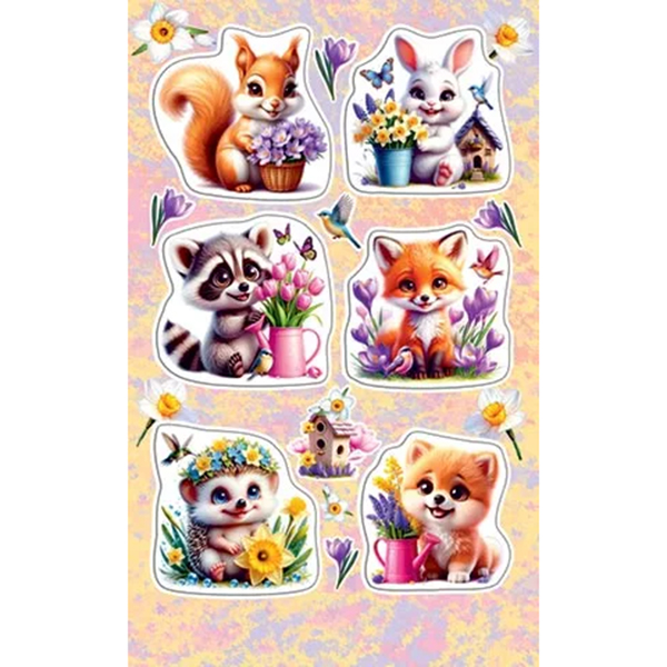 Наклейки " Мир открыток " 0-11 А6 Зверята с весенними букетами, без отделки