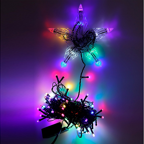 Гирлянда с верхушкой никого не оставит равнодушным! Она поможет создать теплую и уютную атмосферу в доме в новогоднее время года. Такая гирлянда отлично подходит для украшения елки, окно или стены. Также ее можно использовать в качестве ночника. Размер: 9 м. Количество ламп: 100 шт. Свет: мульти. Количество режимов: 8. Материал: металл, пластик, LED, нить шпагат. Упаковка: цветная коробка.