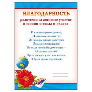 Благодарность родителям за активное участие в жизни школы и класса А4 409 " Мир поздравлений " без отделки, текст