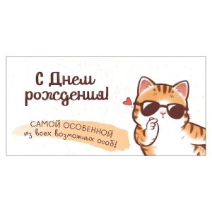 Конверт для денег " Империя поздравлений " 410 С Днем рождения! Рыжий кот в очках, 168*84мм, без отделки, текст