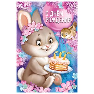 Открытка " Империя поздравлений " 410 Детская- С Днем рождения! Зайка с тортом, 122*182мм, без отделки, текст