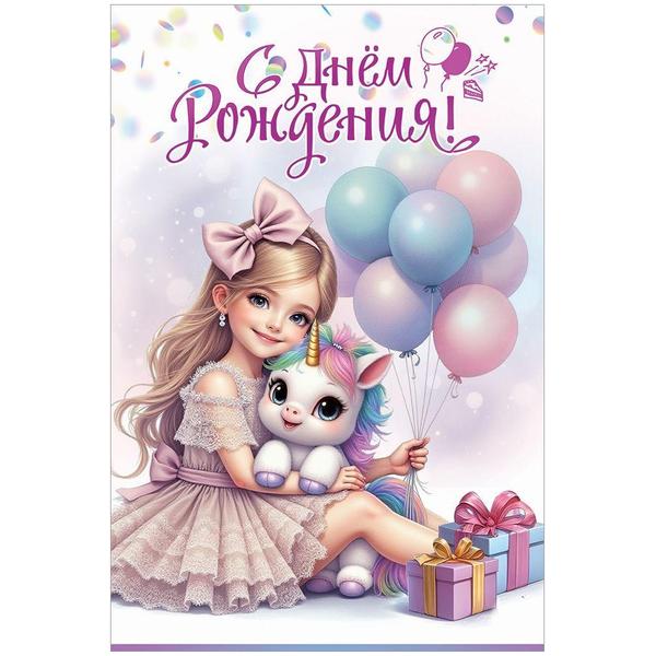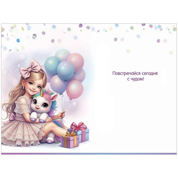 Открытка " Праздник " 410 Детская- С Днем рождения! Девочка с единорогом, шары и подарки, 122*182мм, глянцевый УФ-лак, текст