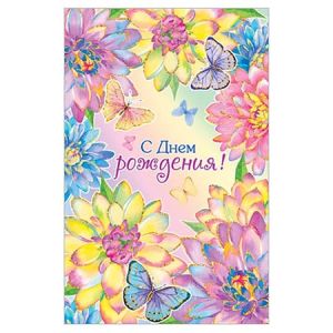 Открытка " Мир открыток " 2-05 С Днем рождения! Яркие цветы и бабочки, 251*194мм, сложнотехническая, текст