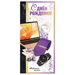 Открытка " Праздник " 410 Евро С Днем рождения! Мужская- Ноутбук, галстук и часы, 98*204мм, без отделки, текст