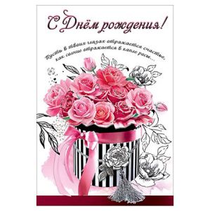 Открытка " Праздник " 445 С Днем рождения! Розовые розы, 126*182мм, термоподъём чёрный, дизайнерская бумага, текст