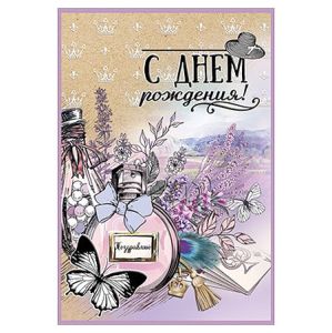 Открытка " Праздник " 445 С Днем рождения! Духи и бабочка, 126*182мм, термоподъём чёрный, дизайнерская бумага, текст