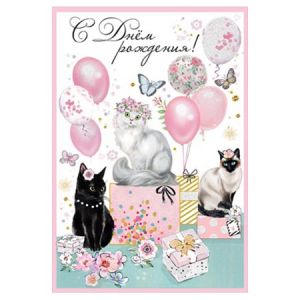 Открытка " Праздник " 445 С Днем рождения! Лаванда, 126*182мм, Кошки и шарики, блестки в лаке, текст