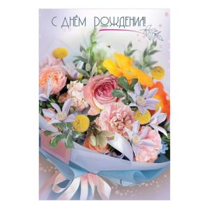 Открытка " Праздник " 445 С Днем рождения! Букет цветов с розовой лентой, 126*182мм, блестки в лаке, текст