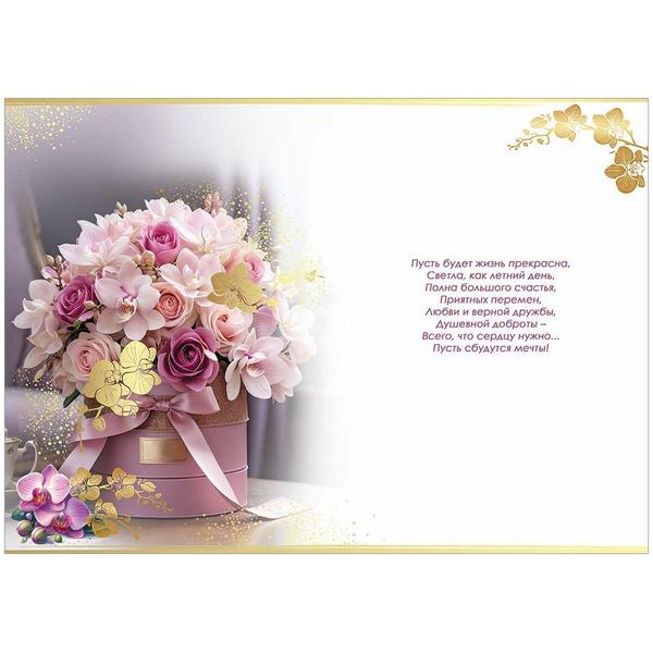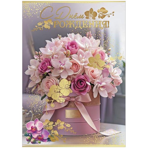 Открытка " Праздник " 750 С Днем рождения! Розовый букет из орхидей, 196*277мм, золотые блестки в лаке, текст