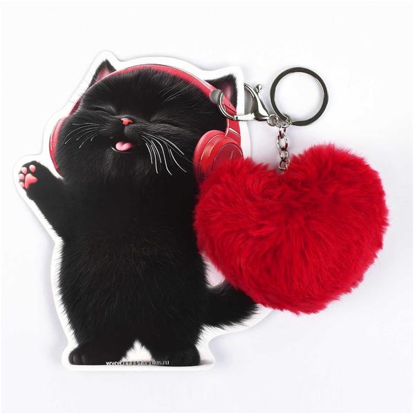 Брелок меховой арт. 71698 / 48 КОТЕНОК В НАУШНИКАХ ( размер подвеса: 90х150 мм, материал подвеса: искусственный мех; форма подвеса: сердце; цвет подвеса: красный; индивидуальная упаковка: подложка из мелованного картона + ПЭТ-пакет с европодвесом.
