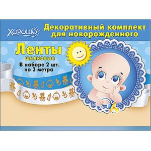 Комлект лент " Хорошо " 635 Для новорожденного, шелк, 2 ленты, цвет- синий и белый, надпись- фольга золотая