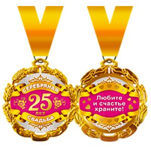 Медаль металлическая Серебряная свадьба! 25 лет! D=70мм " Хорошо " 636 на ленте, фольга