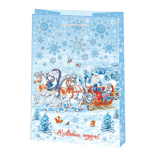 Пакет Новогодний бумажный " Мир открыток " 22*31*10см Тройка лошадей, Дед Мороз, Снегурочка, белки, снегири, ламинированный