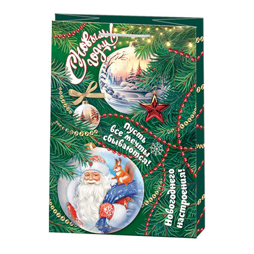 Пакет Новогодний бумажный " Мир открыток " 22*31*10см С Новым годом! Еловые ветки, Дед мороз в шаре, пожелания, ламинированный