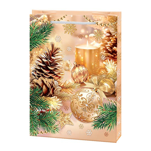 Пакет Новогодний бумажный " Мир открыток " 13,5*18*6см Еловые ветки, шишки, золотые шары, свеча, снежинки, ламинированный