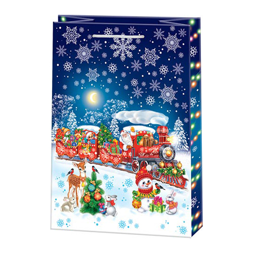 Пакет Новогодний бумажный " Мир открыток " 32,5*45*10см Дед мороз на поезде, игрушки, подарки, звери, птицы, снежинки, ламинированный