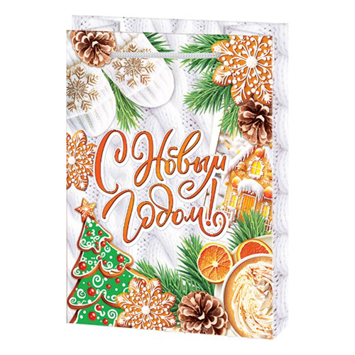 Пакет Новогодний бумажный " Мир открыток " 13,5*18*6см С Новым годом! Новогдние фигурки из пряников, варежки, шишки, мандарин, ламинированный