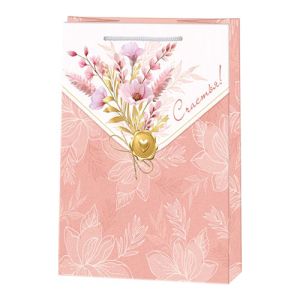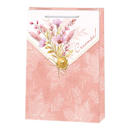 Пакет бумажный " Мир открыток " 18*22,7*10см Розовые цветы и золотой штамп, ламинированный