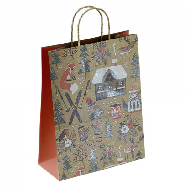 Пакет Новогодний бумажный крафт " ПЗБМ " 26*35*15см Лыжи, крученые ручки
