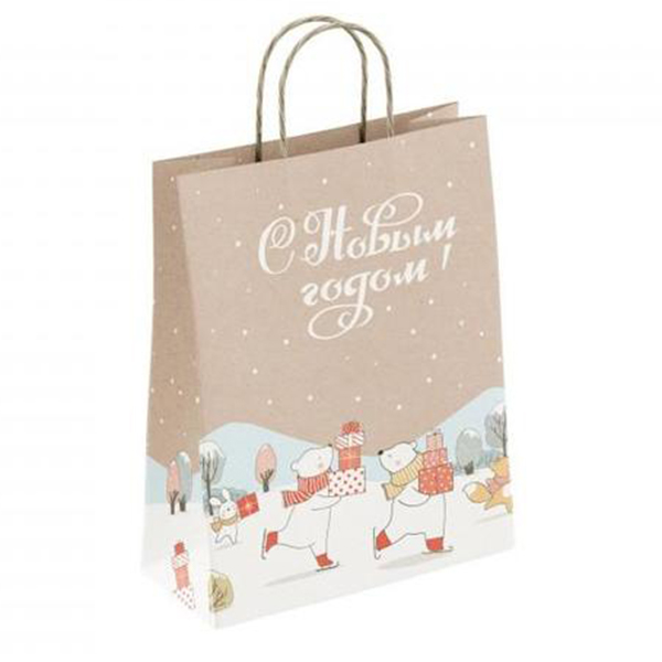 Пакет Новогодний бумажный крафт " ПЗБМ " 22*25*12см Мишки на льду, крученые ручки